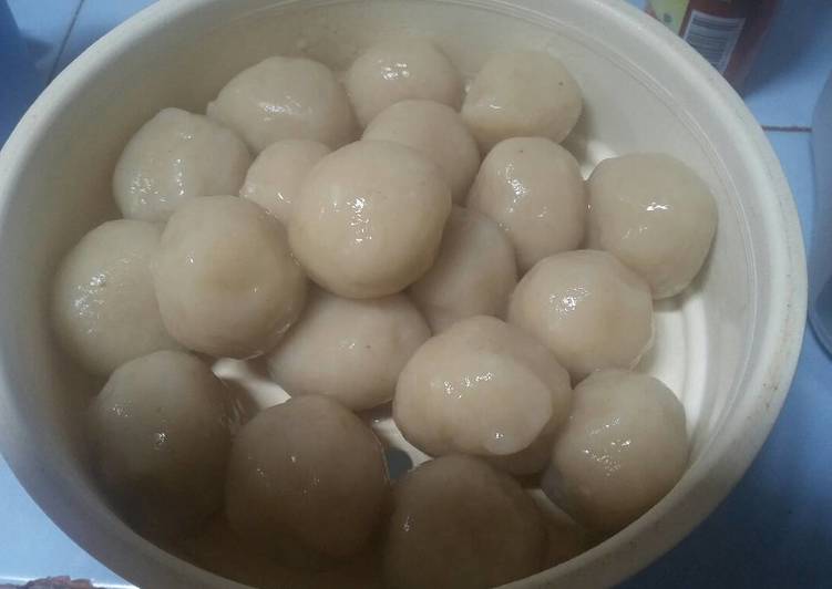 3. Setelah air panas, ambil sedikit lalu tuangkan ke dalam adonan. Aduk hingga adonan mengental dan bentuk menjadi bola-bola.