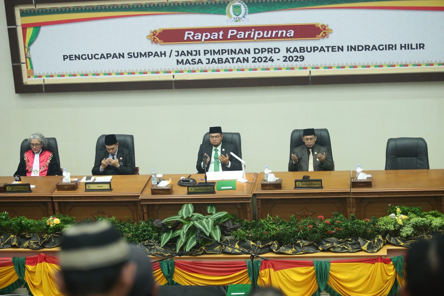 TEMBILAHAN - Dewan Perwakilan Rakyat Daerah (DPRD) Kabupaten Indragiri Hilir (Inhil) menggelar pelantikan ketua dan wakil ketua DPRD priode 2024-2029, Rabu 16 Oktober 2024.