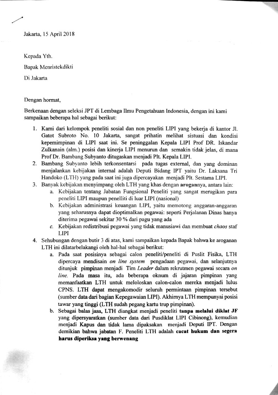 Dalam dokumen surat keluhan ke Menteri Riset dan Teknologi Tinggi, Sabtu (12/5/2018), kelompok peneliti sosial dan non peneliti LIPI yang kantornya berada di Jalan Gatot Subroto, Jakarta, merasa kinerja LIPI semakin menurun dan tidak jelas sepeninggal almarhum Kepala LIPI, Iskandar Zulkarnain.