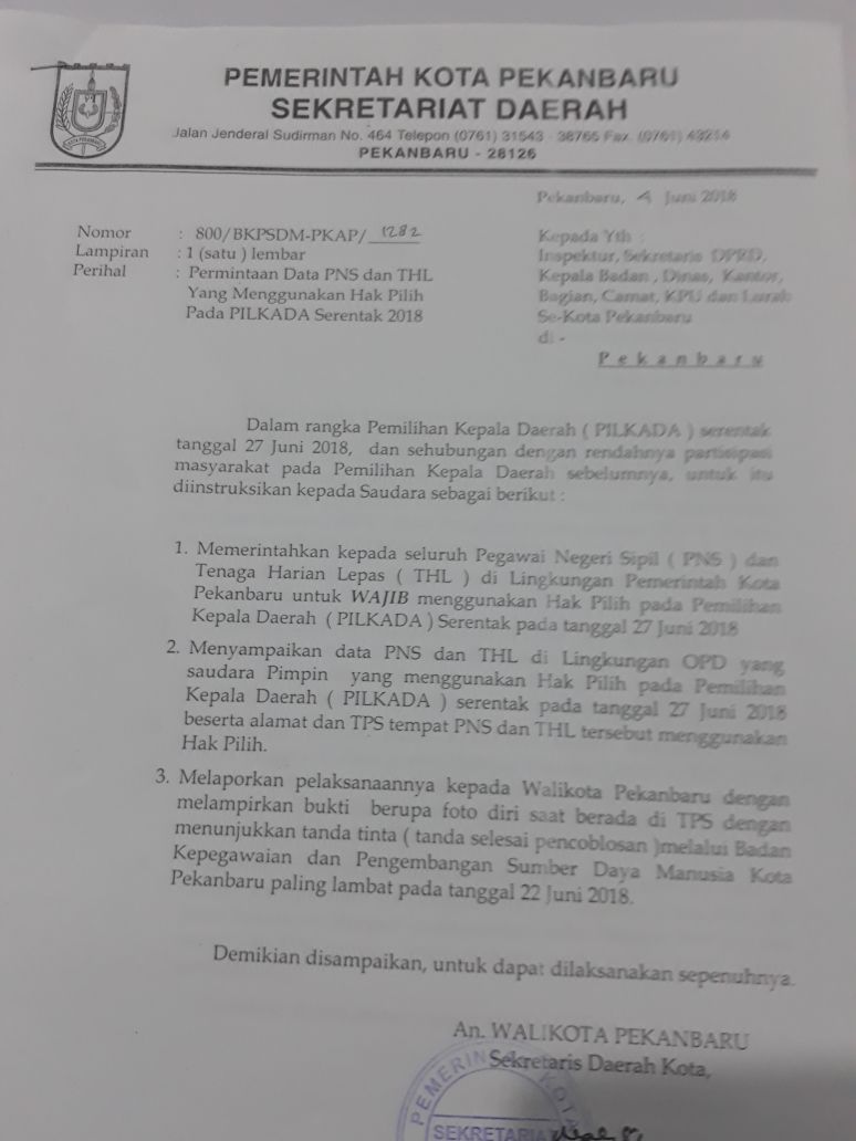 Dalam surat dengan nomor 800/BKPSDM-PKAP/1282 tertanggal 4 Juni 2018, disebutkan jika seluruh ASN wajib menggunakan hak pilihnya. Alasannya, Pemko Pekanbaru berharap persentase golput pada Pilwako tahun lalu sebesar 52 persen tidak terjadi lagi di Pilgubri 2018 ini.