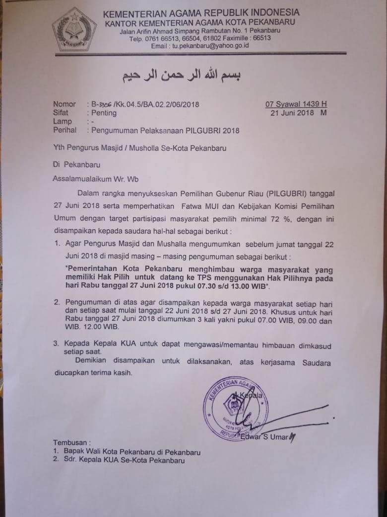 Ternyata, upaya yang sama juga dilakukan Kementrian Agama (Kemenag) Kota Pekanbaru. Melalui surat dengan nomor B-3306/Kk.04.5/BA.02.2/06/2018 tertanggal 21 Juni 2018 juga menginstruksikan seluruh pengurus masjid untuk menguumumkan dan mengajak jamaah ikut berpartisipasi dalam pilgubri akan datang. Surat tersebut ditandatangni Kepala Kemenang RI Kota Pekanbaru Edwar S Umar juga memiliki 3 poin.