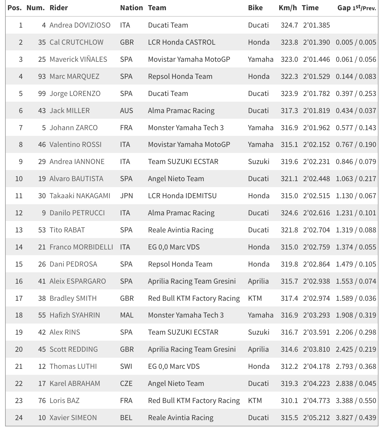 Marquez ada di posisi keempat dengan 2 menit 01, 529 detik yang diikuti Jorge Lorenzo dengan 2 menit 01,782 detik. Melengkapi posisi 10 besar ada Jack Miller, Johann Zarco, Rossi, Andrea Iannone, dan Alvaro Bautista.*