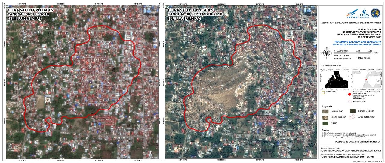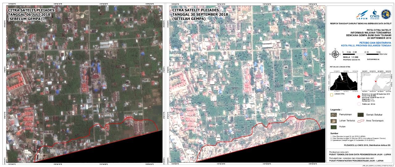 LAPAN pun merilis foto sebelum dan sesudah bencana alam terjadi di Palu. Melalui data yang digunakan adalah data satelit Pleiades pada 6 Juli 2018 (sebelum gempa) yang diterima oleh Stasiun Bumi LAPAN dan tanggal 30 September (Setelah gempa) yang diperoleh Internasional Disaster Charter. Sebagai informasi, Pleiades adalah satelit milik Perancis dengan memiliki resolusi spasial 60 cm.