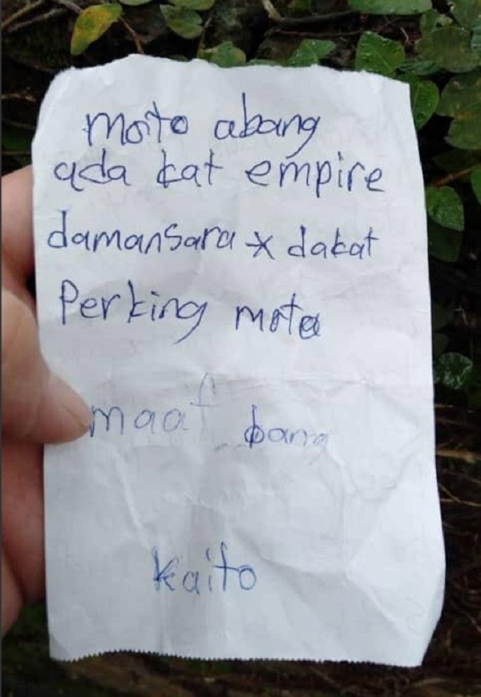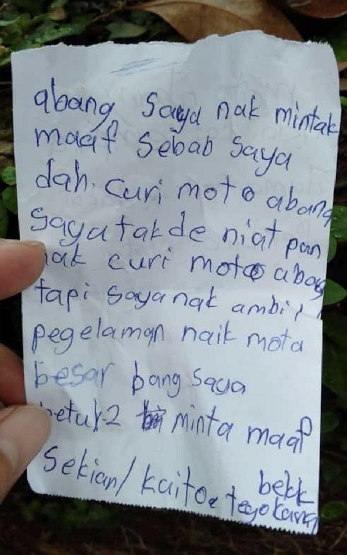 "Abang, saya minta maaf sebab saya sudah curi motor abang. Saya tidak ada niat untuk mencuri, tapi saya ingin menambah pengalaman naik motor besar abang. Saya betul-betul minta maaf. Sekian/Kaito," tulisnya.