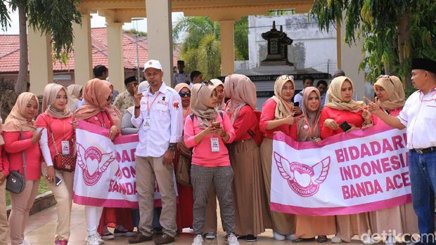 Berdasarkan pantauan detikcom, Sandiaga tiba di Makam Sultan Iskandar Muda sekitar pukul 11.00 WIB, Selasa (20/11/2018). Begitu turun dari mobil, sejumlah emak-emak sudah menunggu sambil memegang spanduk bertulisan 'Bidadari Indonesia Banda Aceh'.