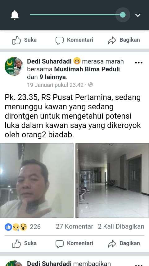 Sinyal informasi publik terkait insiden ini bermula dari postingan media sosial Facebook akun Dedi Suhardadi yang menyebutkan, "Pk 23.35, RS. Pusat Pertamina, sedang menunggu kawan yang sedang dirontgen untuk mengetahui potensi luka dalam kawan saya yang dikeroyok oleh orang-orang biadab,".