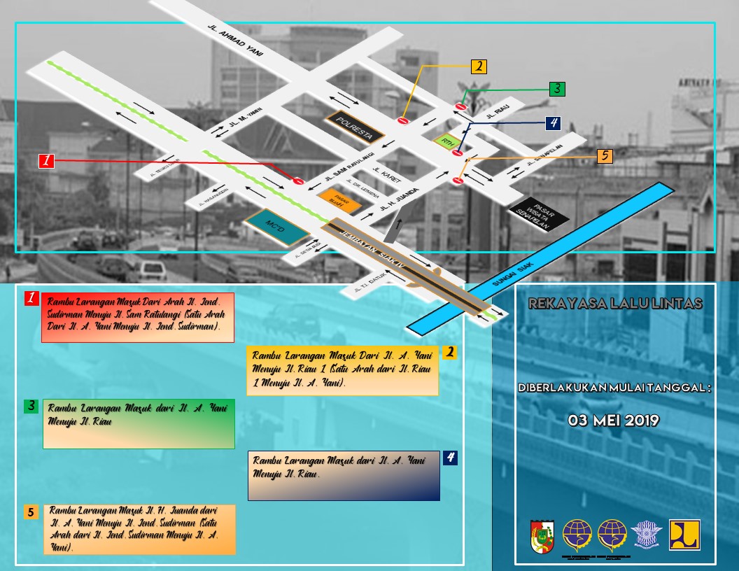 Dari informasi yang diperoleh, Dishub sudah memasang rambu larangan masuk dari arah Jalan Jenderal Sudirman menuju Jalan Sam Ratulangi (satu arah dari Jalan Ahmad Yani menuju Jalan Jenderal Sudirman). Selain itu, hal serupa juga berlaku untuk Jalan Ahmad Yani menuju Jalan Riau I (satu arah dari Jalan Riau I menuju Jalan Ahmad Yani.