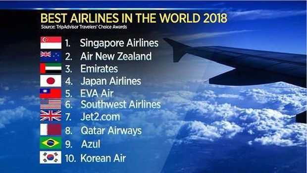 Dalam penjelsan TripAdvisor, mereka sudah meneliti tanggapan wisatawan selama 12 bulan dengan memperhitungkan kuantitas dan kualitas ulasan. Air New Zealand berada di urutan kedua, menggeser posisi pemenang tahun lalu, Emirates, yang turun ke tempat ketiga. Maskapai Asia juga berkinerja baik, dimana tiga maskapainya (Jepang, EVA Air dan Korean Air) masuk di 10 besar.