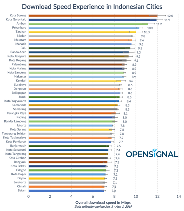 Hal tersebut terungkap dalam laporan OpenSignal terbaru. Mereka menganalisis kecepatan rata-rata broadband seluler di 44 kota besar di Indonesia. Untuk kecepatan download, Kota Sorong di Papua Barat menjadi yang tercepat dengan kecepatan mencapai 12 Mbps. Selanjutnya Gorontalo dengan kecepatan download 11,9 Mbps, Ambon 10,3 Mbps serta Kota Pekanbaru dengan kecepatan 10 Mbps.