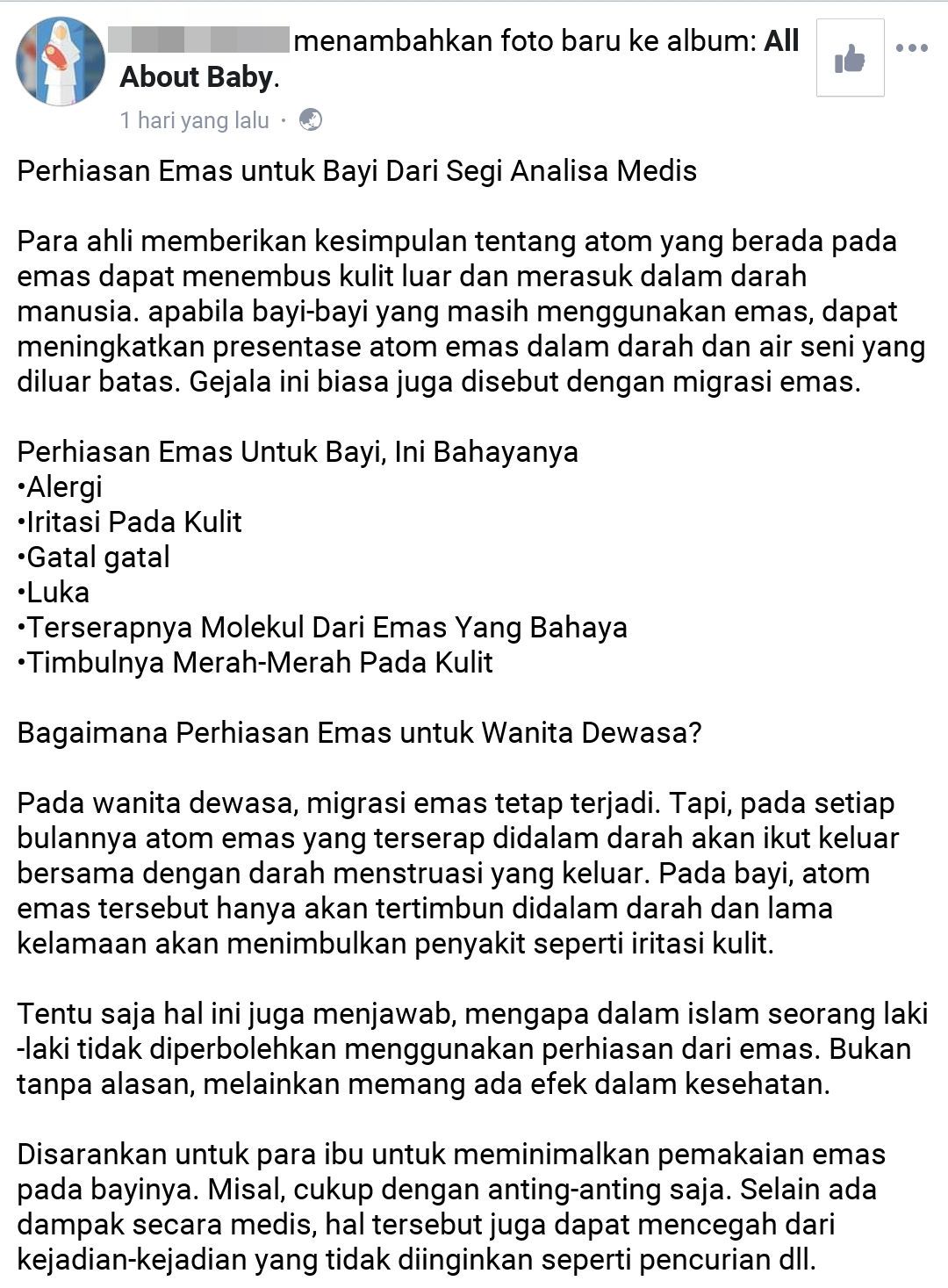 JAKARTA - Di media sosial Facebook viral unggahan yang menyebut bahwa perhiasan emas berbahaya bagi bayi karena partikelnya bisa menembus kulit masuk ke dalam aliran darah. Hal ini disebut sebagai "migrasi emas" yang berisiko menimbulkan penyakit mulai dari alergi, iritasi, gatal, luka, hingga timbul kemerahan.