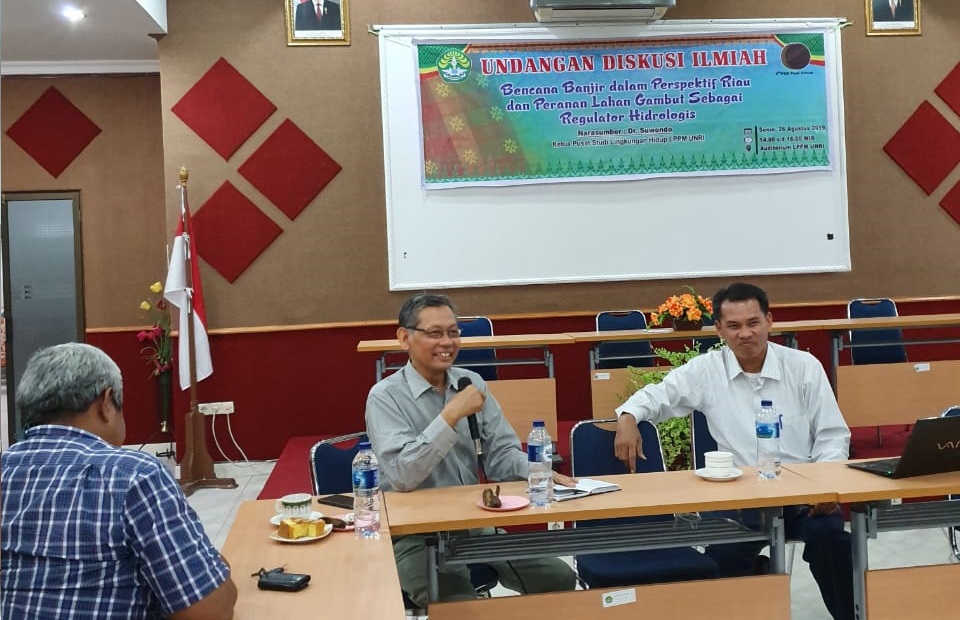 Hal tersebut mengemuka dalam diskusi ilmiah “Bencana Banjir dalam Perspektif Riau dan Peranan Lahan Gambut sebagai Regulator Hidrologis” yang ditaja oleh Pusat Studi Bencana (PSB), LPPM Universitas Riau, pada hari Senin 26 Agustus 2019 kemaren. Dr. Suwondo yang menjadi narasumber dalam diskusi ini menguraikan akar permasalahan dari bencana banjir di provinsi ini. Menurut narasumber yang juga Ketua Pusat Studi Lingkungan Hidup (PSLH) LPPM Universitas Riau ini, ada lima hal penting yang melatar-belakangi terjadinya bencana banjir.