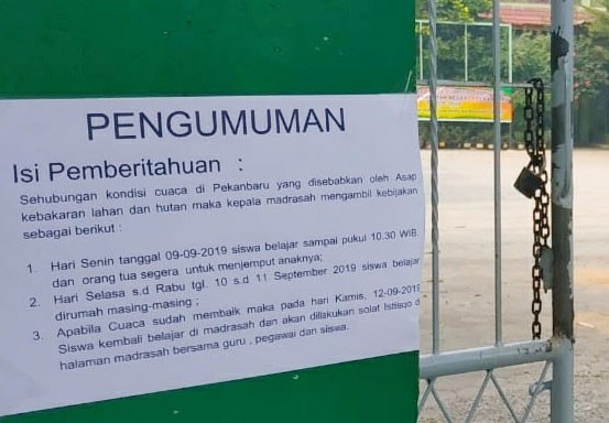 Pengumuman tersebut jelas terlihat dari pengumuman soal memulangkan siswa di gerbang masuk MTs 1 Pekanbaru agar bisa dibaca para orang tua siswa. Diterangkannya juga, kebijakan ini sudah dibahas dalam rapat pihak sekolah dan mengacu surat edaran Kementerian Agama. Selain itu, sekolah juga mengambil kebijakan untuk meliburkan siswa pada Selasa (10/9) hingga Rabu (11/9), dan masih bisa diperpanjang jika kondisi udara tetap parah.