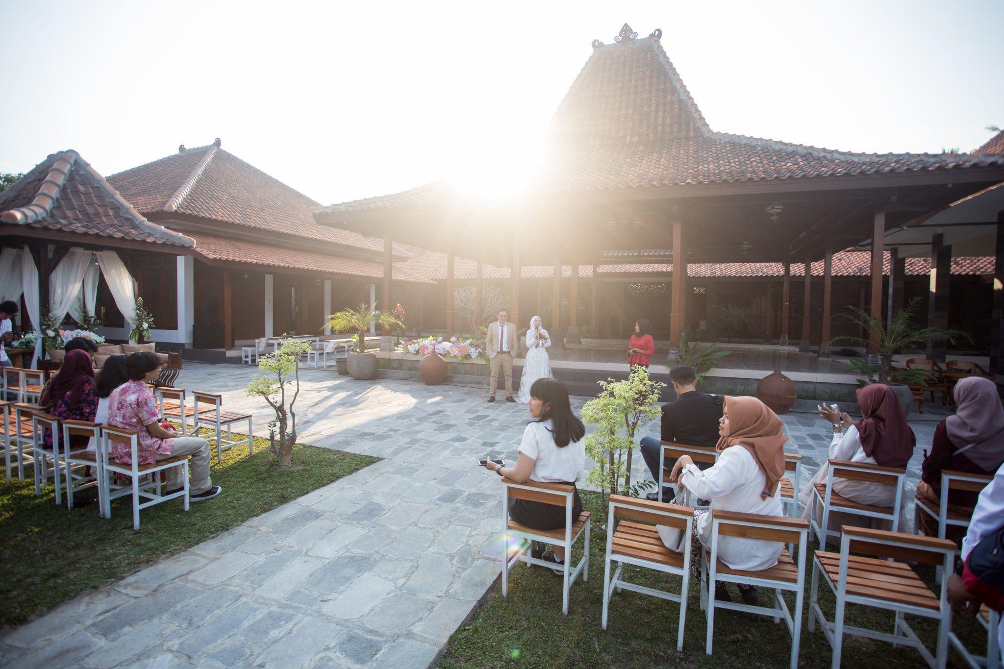 "Aku sampaikan ke Bu Nunik (pemilik joglo) kalo aku hanya mau untuk 150 orang aja, tanpa mc & dokumentasi. Maunya garden party jadi banyak kursi biar semua bisa duduk, aman buat main anak, dan gausah pelaminan karena acara tanpa keluarga," jelas Riza.
