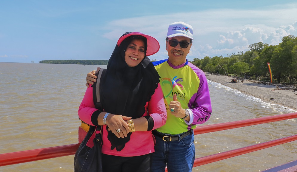 Gubernur Riau, H Syamsuar (kanan) didampingi istri Hj. Misnarni ketika berkunjung ke Pantai Solop Pulau Cawan Kabupaten Indragiri Hilir. (Foto Dispar Riau)