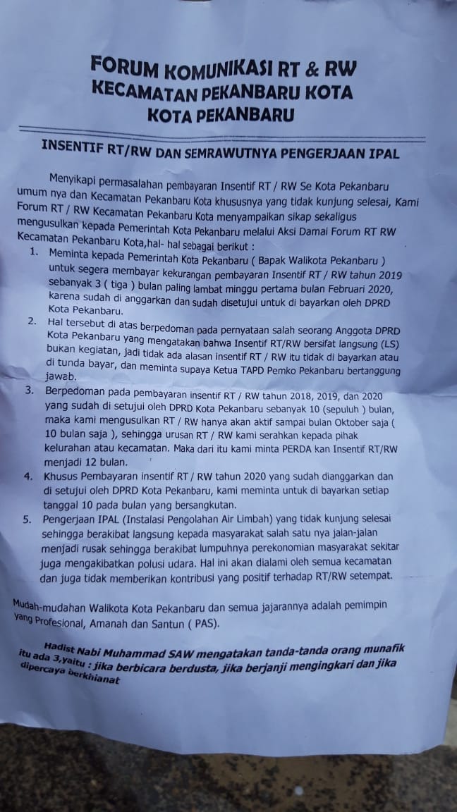 Tuntutan tersebut terungkap dari selebaran aksi yang dibacakan Kordinator Forum Komunikasi RT/RW, Andrianto dihadapan Kepala Badan Pengelola Keuangan dan Aset Daerah (BPKAD) Pekanbaru, Sofaizal.
