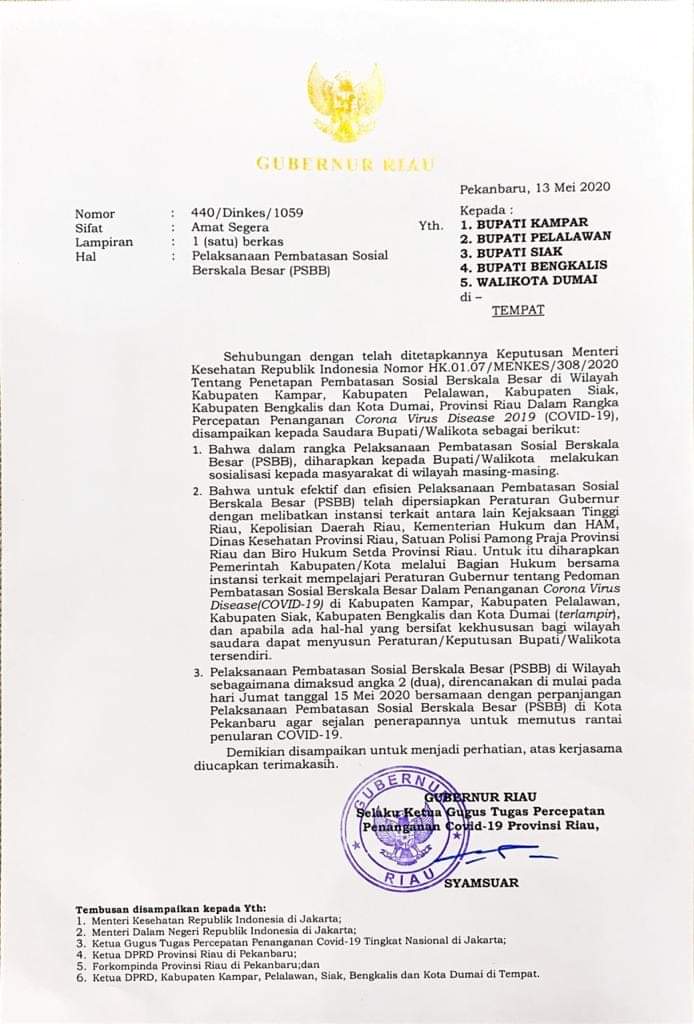 PEKANBARU - Sekretaris Gugus Tugas Tim Penanganan Covid 19 Provinsi Riau, Syahrial Abdi menyampaikan penerapan Pembatasan Sosial Berskala Besar (PSBB) di Provinsi Riau, akan dilaksanakan pada Jumat (15/05/20) mendatang.