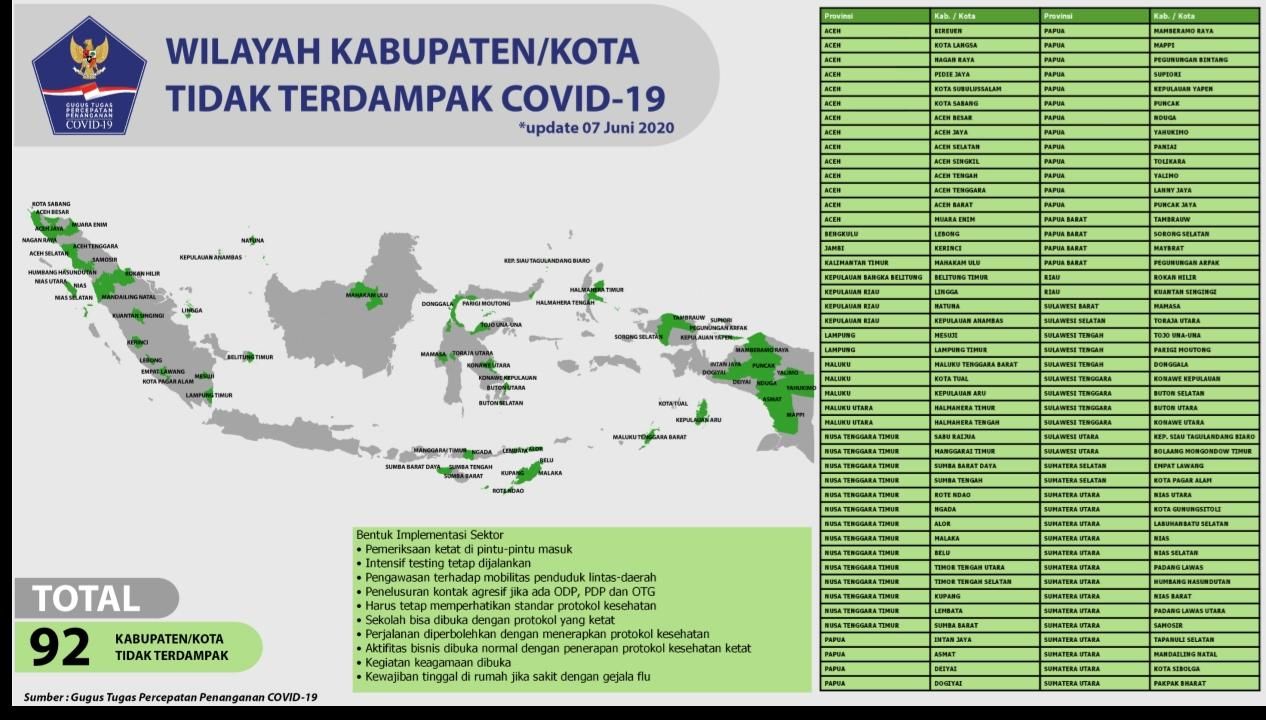 Doni mengatakan 92 daerah tersebut merupakan data per 7 Juni 2020. Zona hijau tersebut tersebar di beberapa provinsi, seperti Aceh, Bengkulu, Jambi, Kalimantan Timur, Kepulauan Bangka Belitung, Kepulauan Riau, Lampung, Maluku, Maluku Utara, Nusa tenggara Timur, Papua, Papua Barat, Riau, Sulawesi Barat, Sulawesi Tengah, Sulawesi Selatan, Sulawesi Tenggara, Sulawesi Utara, Sumatera Selatan, dan Sumatera Utara.