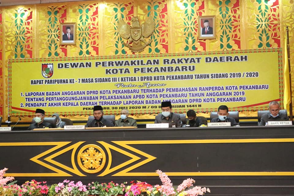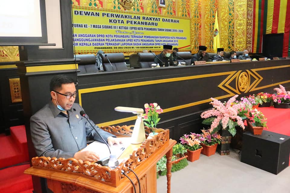 PEKANBARU - DPRD Kota Pekanbaru menggelar Rapat Paripurna dengan Agenda Penyampaian Laporan Badan Anggaran (Banggar) DPRD Kota Pekanbaru terhadap Pembahasan Rancangan Peraturan Daerah (Ranperda) tentang Laporan Pertanggungjawaban (LPP) APBD Kota Pekanbaru tahun anggaran 2019 sekaligus pendapat akhir kepala daerah terhadap laporan Banggar  DPRD Kota Pekanbaru, Kamis (30/7/2020).