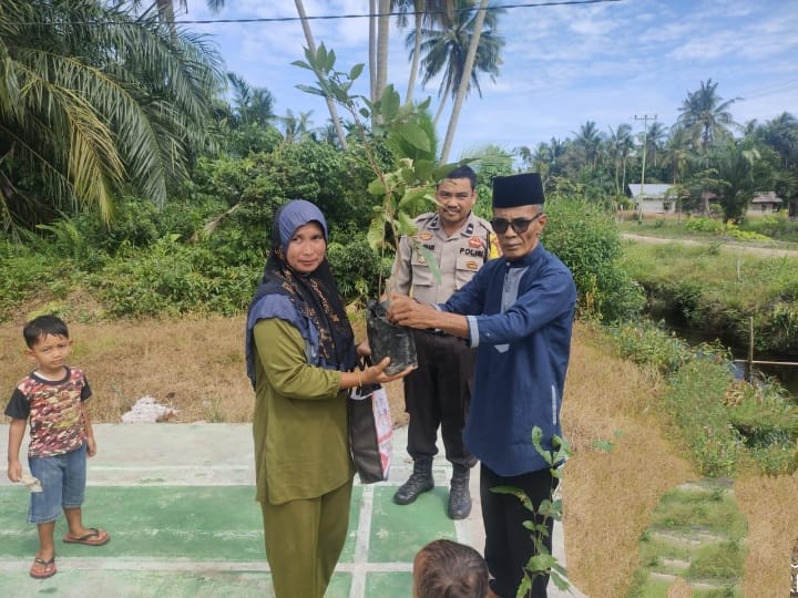 BENGKALIS - Personel Polsek Bantan hadiri pemberian bantuan bibit tanaman buah Pemerintah Desa (Pemdes) Teluk Lancar kepada warga, Jumat (16/12/2022). Pemberian bibit tanaman ini dalam rangka mewujudkan pelestarian lingkungan hidup di Kecamatan Bantan.