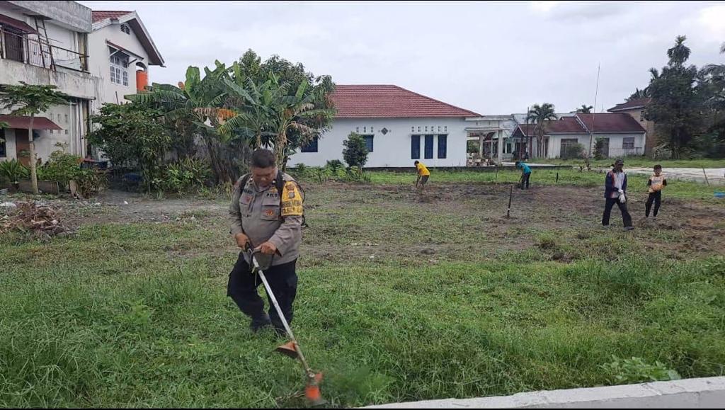 BENGKALIS - Personel Polsek Mandau melakukan gotong royong bersama warga Kelurahan Balik Alam, Kecamatan Mandau, Rabu (28/12/2022).