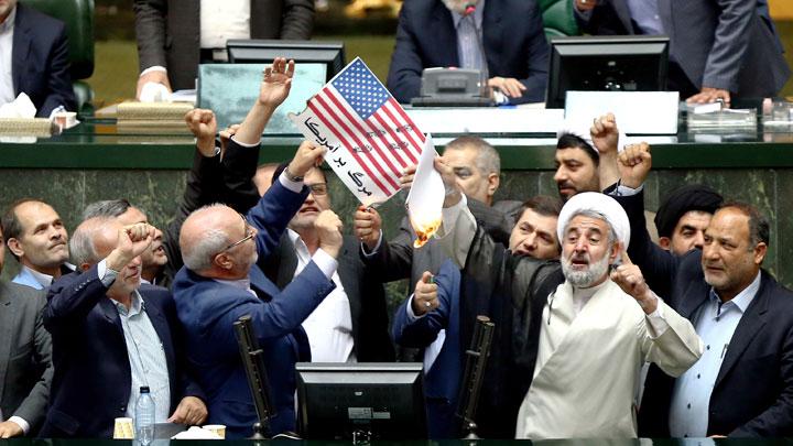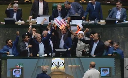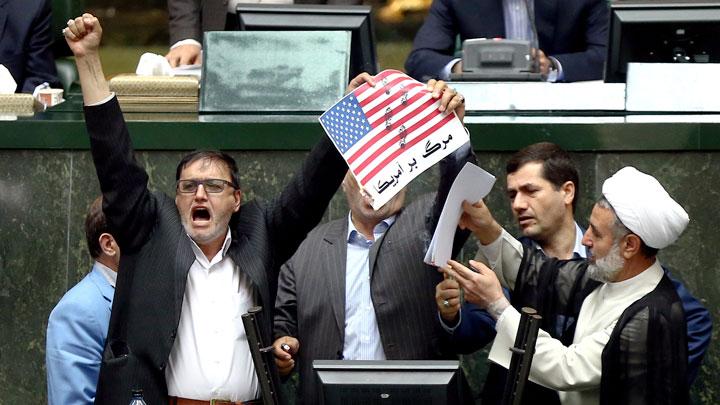 Setelah itu, puluhan anggota parlemennya ikut meneriakkan "Matilah Amerika", slogan yang kerap didengungkan para politikus konservatif Iran.