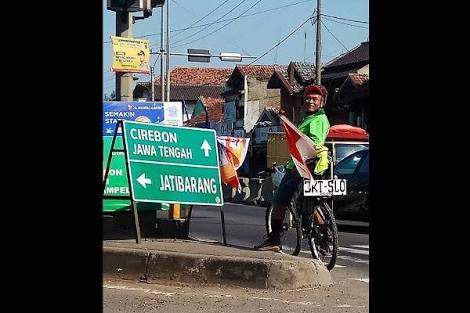 Pria paruh baya itu juga mengikatkan bendera merah putih dan pelat hitam bertuliskan JKT-SLO pada bagian belakang sepedanya.