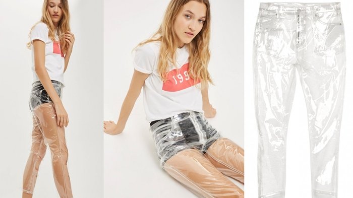 “Your look will be anything but transparent in these trousers, girl,” bunyi keterangan produk untuk celana panjang plastik transparan di situs resmi Pretty Little Thing.