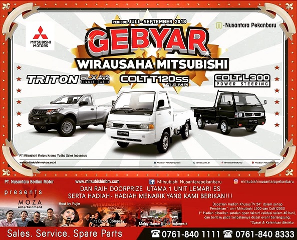 PEKANBARU - PT Nusantara Berlian Motor (NBM) Arengka, Pekanbaru kembali gelar Gebyar Wirausaha Mitsubishi bagi pengguna Colt T120 SS, Colt L300 dan Triton Single Cabin 4x2 di Hotel Pangeran, Pekanbaru, Rabu (25/7/2018). Kali ini, NBM targetkan sebanyak 30 SPK.