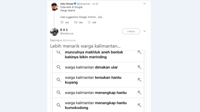 JAKARTA - Algoritme Google diciptakan untuk membantu mengatur dan memprioritaskan informasi yang disajikan dalam hasil pencarian. Seperti yang dilakukan oleh para warganet di platform Twitter, saat mengetikkan kata warga kota tertentu, maka akan muncul beberapa suggestion yang diberikan oleh Google.