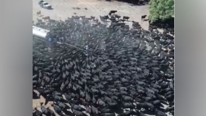 Dalam sebuah video singkat yang diunggah akun Instagram smart.gram, terlihat sapi-sapi tersebut mengerumuni sebuah truk tanki berisi air. Ratusan sapi hitam itu tampak sangat kehausan. Video yang direkam melalui drone ini benar-benar memperlihatkan sesuatu yang sangat luar biasa. Simak videonya berikut ini.