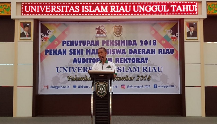 PEKANBARU - Rektor Universitas Islam Riau (UIR) Prof. Dr. H. Syafrinaldi, S.H., M.C.L menutup pelaksanaan Pekan Seni Mahasiswa Daerah (Peksimida) Riau tahun 2018. Closing ceremony berlangsung Jum'at (7/9/2018) di Gedung Rektorat UIR Perhentian Marpoyan Pekanbaru. Selain dihadiri Sekretaris BPSMI Prof. Zuchra Helwani, ST., MT., PhD., juga Wakil Rektor I UIR Dr. H. Syafhendry, Wakil Rektor II Ir. Asrol, serta Dekan FKIP Drs. Alzaber.