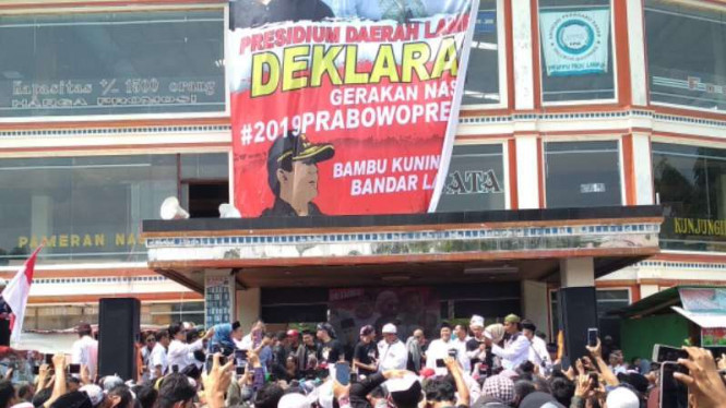 LAMPUNG - Ribuan warga Bandar Lampung menghadiri deklarasi Gerakan #2019Prabowo Presiden di Bambu Kuning Square, Kemarin. Deklarasi ini merupakan yang pertama di Indonesia untuk menjadikan Prabowo Subianto dan Sandiaga Uno sebagai presiden dan wakil presiden pada 2019.