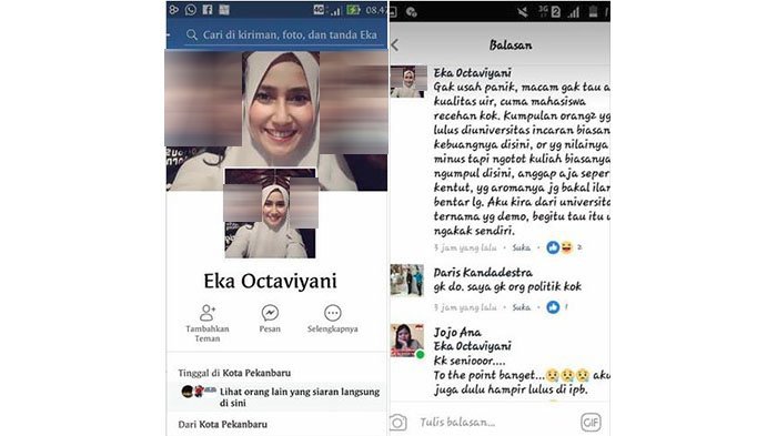 "Gak usah panik, macam gak tau aja kualitas UIR, cuma mahasiswa recehan kok. Kumpulan orang2 yg gk lulus diuniversitas incaran biasanya kebuangnya disini, anggap aja seperti kentut, yg aromanya jg bakal ilang bentar lg. Aku kira dari universitas ternama yg demo, begitu tau itu uir, ngakak sendiri," tulis Eka Octaviyani di kolom komentar.*