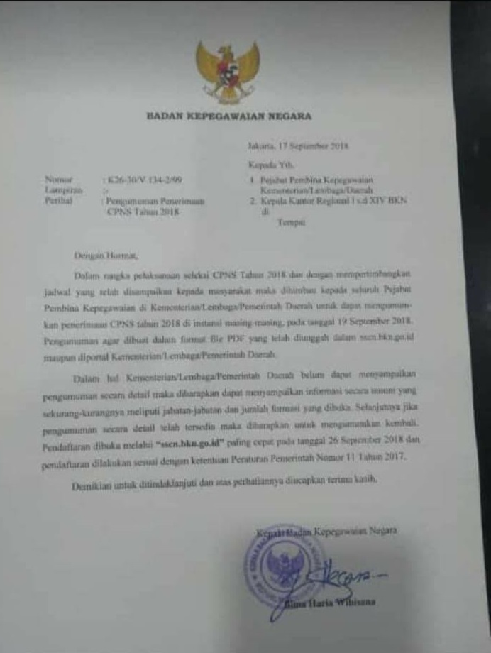 Surat dari Badan Kepegawaian Negara (BKN) yang beredar melalui aplikasi, terlihat surat ditujukan kepad seluruh pejabat pembina kepegawaianan Kementrian/lembaga/daerah tertanggal 17 September 2018. Dalam surat dengan nomor K26-30/V.134-2/99 disebutkan jika pengumuman seleksi CPNS tetap dilakukan pada 19 September 2018.