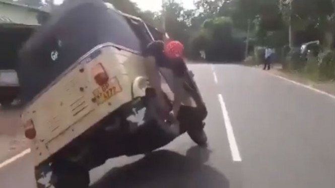 Jika biasanya sebuah kendaraan akan menghentikan lajunya saat mengalami kebocoran ban, berbeda dengan bajaj di India yang satu ini. Sopir bajaj ini nekat mengganti bannya yang bocor sambil tetap melaju. Tentu saja ini berbahaya karena bajaj harus melaju hanya dengan ban di satu sisinya saja.