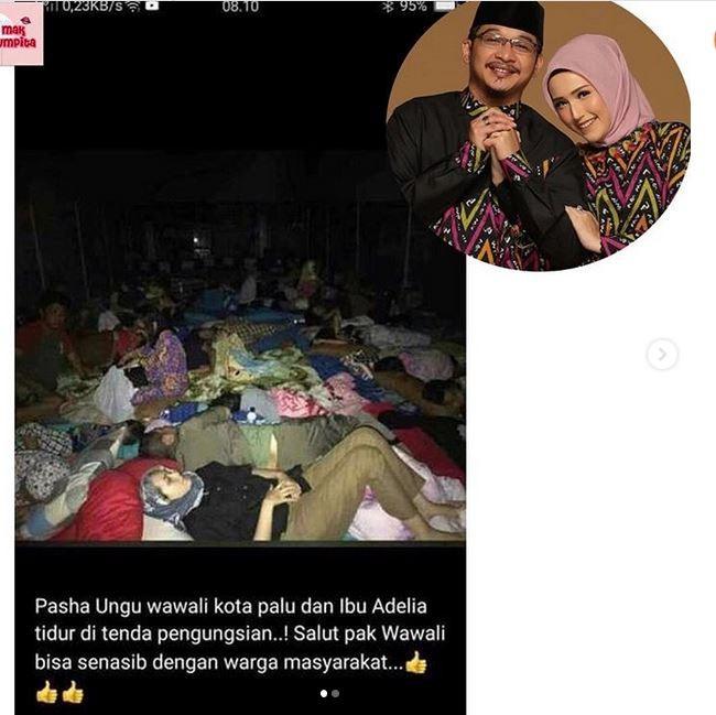 "Pasha Ungu Wawali Kota Palu dan Ibu Adelia tidur di tenda pengungsian. Salut Pak Wawali bisa senasib dengan warga masyarakat," bunyi kalimat di foto tersebut.