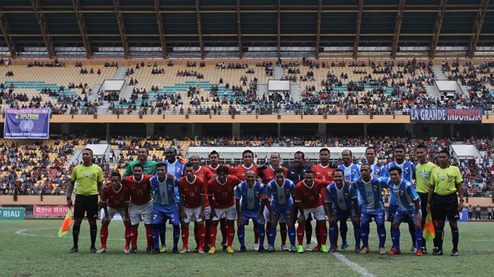 PEKANBARU -  Laga amal PSPS All Star vs Timnas Indonesia All Star yang digelar di Stadion Utama Riau (SUR), Ahad (21/10/2018), berakhir untuk kemenangan Bimas Sakti cs dengan skor 0-2. Gol-gol kemenangan Timnas Indonesia All Star dicetak Bambang Pamungkas.