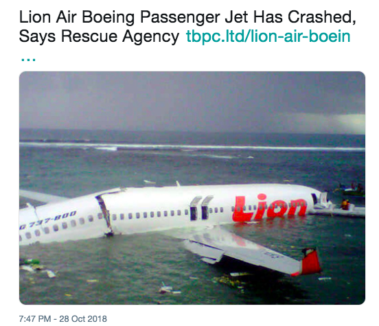 Salah satunya terpajang foto di sebuah media luar negeri yang menampakkan pesawat Lion Air rusak di atas laut. Namun bisa dipastikan foto tersebut bukan memperlihatkan pesawat yang jatuh hari ini, melainkan pada insiden sebelumnya.