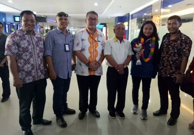 Melva Natalia Siregar dan Dimas Hadi tiba di Pekanbaru, Jumat (23/11/2018). Kedatangan mereka langsung disambut oleh Bupati Pelalawan HM Harris, Bupati Siak Syamsuar, Managemen RAPP, Keluarga dan juga pelatih.
