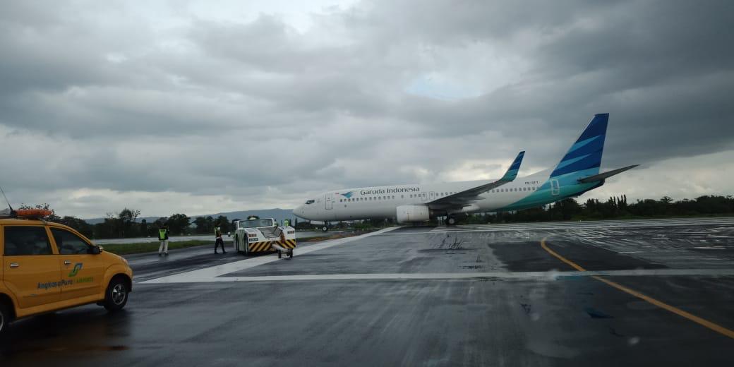 Petugas Bandara Adisutjipto langsung melakukan evakuasi. Pesawat bisa didorong mundur dan kembali masuk di runway.
