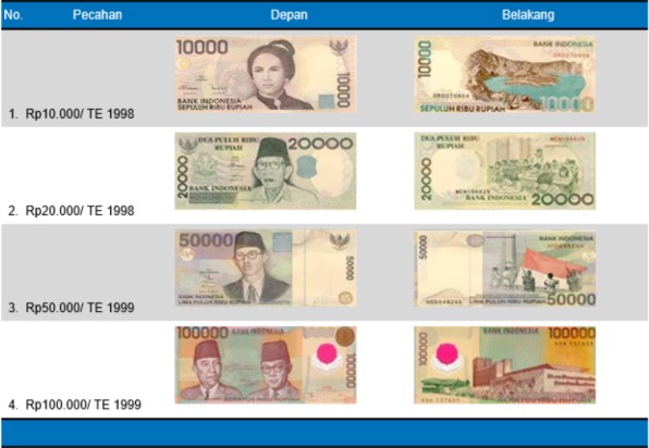 Berikutnya, uang kertas yang ditarik yaitu pecahan Rp50 ribu tahun emisi 1999 dengan gambar muka pahlawan nasional WR. Soepratman, serta uang pecahan Rp100 ribu tahun emisi 1999 dengan gambar muka pahlawan Proklamator Dr Ir Soekarno dan Dr H Mohammad Hatta.