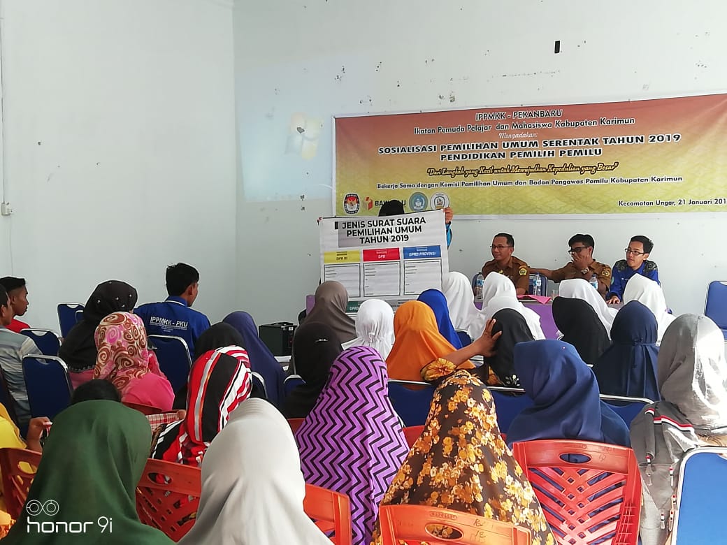 KUNDUR - Ikatan Pemuda Pelajar dan Mahasiswa Kabupaten Karimun (IPPMKK) menggelar kegiatan sosialisasi pemilu bekerja sama dengan Komisi Pemilihan Umum (KPU) dan Badan Pengawas Pemilu (Bawaslu) Kabupaten Karimun pada Senin, (21/01/2019) di gedung serbaguna Desa Batu Limau Kecamatan Ungar.