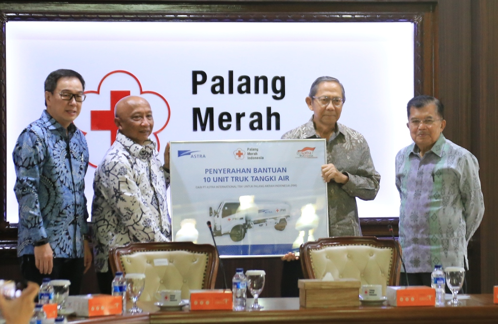 Presiden Direktur PT Astra International Tbk Prijono Sugiarto menyerahkan secara langsung bantuan berupa truk tangki secara simbolis tersebut kepada Pelaksana Harian (Plh) Ketua Umum PMI Ginandjar Kartasasmita yang disaksikan Ketua Umum PMI Jusuf Kalla.