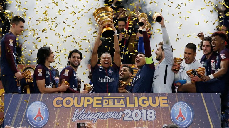 BORDEAUX - Paris Saint-Germain melanjutkan dominasinya di Coupe de La Ligue (Piala Liga Prancis). PSG juara untuk kelima kalinya secara beruntun usai mengalahkan AS Monaco. Dalam pertandingan final di Stade Matmut-Atlantique, Ahad (1/4/2018) dini hari WIB, PSG menang dengan skor 3-0. Gol-gol PSG dibuat oleh Edinson Cavani (dua gol) dan Angel Di Maria.