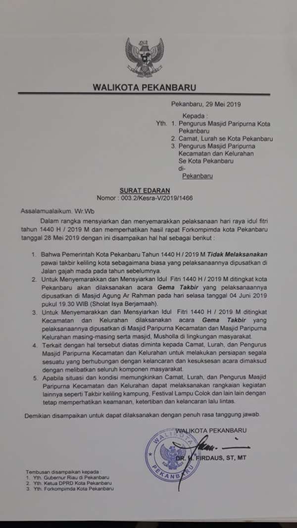 Kebijakan ini tertuang dalam surat edaran Wali Kota Pekanbaru 003/Kesra-V/2019/1456, Tanggal 29 Mei 2019. Kepala Bagian Kesra Kota Pekanbaru, H. Sarbaini, menjelaskan bahwa dalam surat edaran Wali Kota tersebut ditegaskan bahwa Gema takbir dipindahkan ke Masjid-Masjid Parpurina di Kota Pekanbaru dan untuk tingkat Kota Pekanbaru dipusatkan di Masjid Agung Ar Rahman.