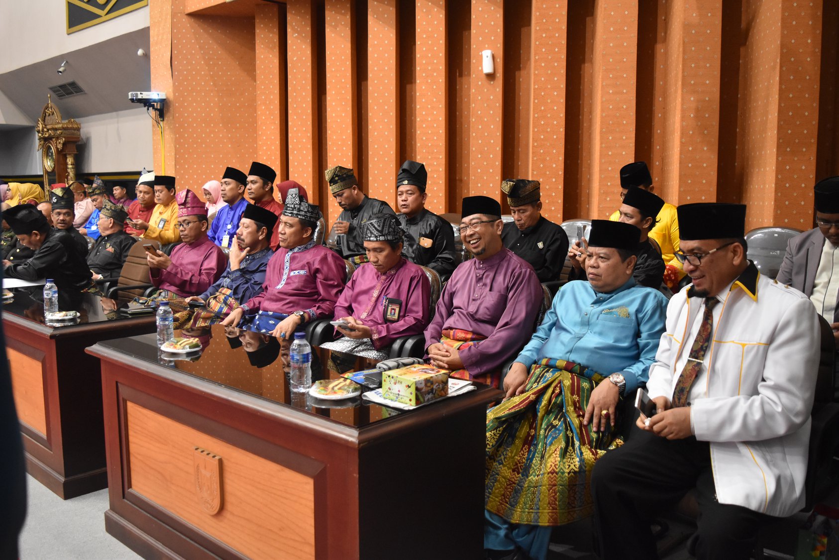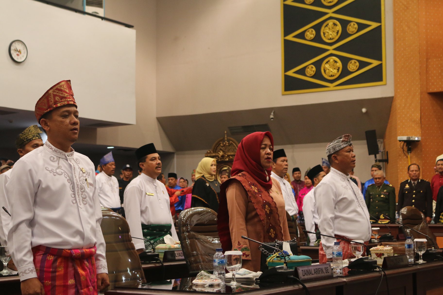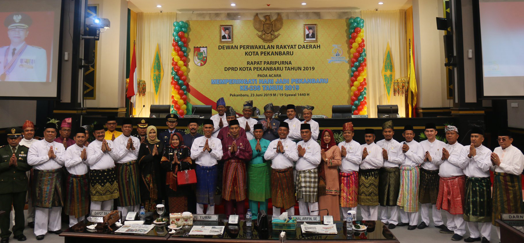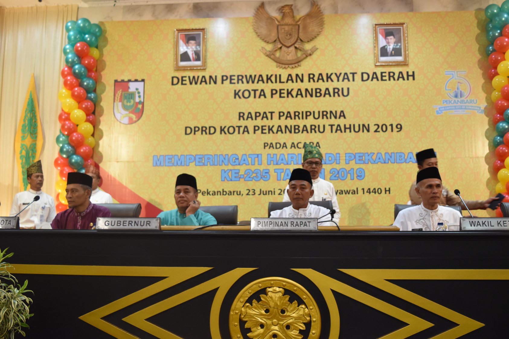 PEKANBARU - Dalam rangka hari jadi Pekanbaru ke 235, DPRD Kota Pekanbaru menggelar rapat paripurna istimewa, Ahad (23/6/2019). Dipimpin Wakil Ketua DPRD Kota Pekanbaru, Sigit Yowono, paripurna dimulai pukul 09.30 wib. Turut hadir saat paripurna ini Wakil Walikota Pekanbaru H Ayat Cahyadi SSi, Asisten I Sekdaprov Riau Ahmadsyah Haroffie, jajaran Forkompinda Kota Pekanbaru, para anggota DPRD Kota Pekanbaru dan masyarakat lainnya.