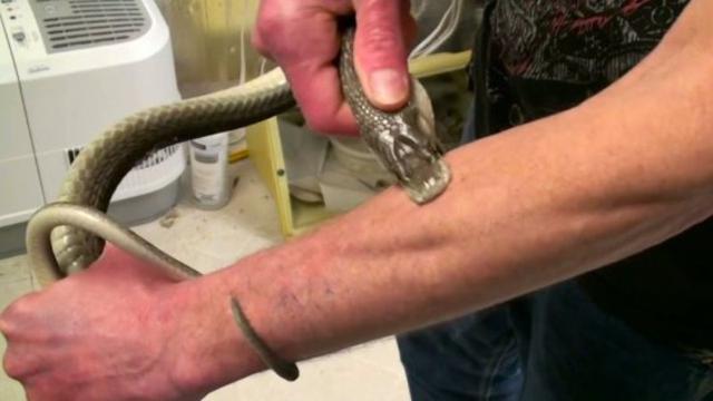 Kumar tidak sadar ada seekor ular tikus yang tidak berbisa masuk ke rumahnya. Dia terkejut ketika hewan melata itu tiba-tiba menggigitnya.