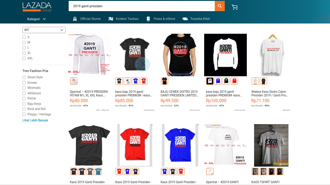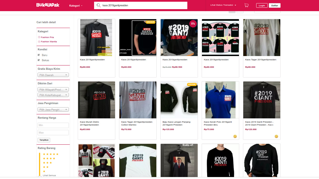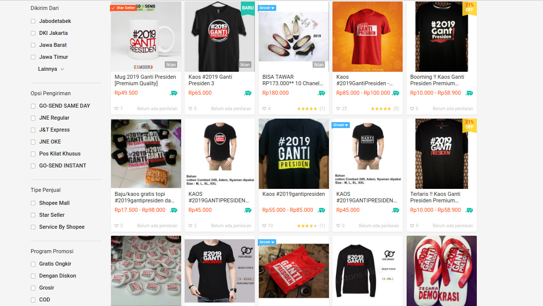 Sedangkan kaus #2019GantiPresiden yang dijual secara offline dijual antara Rp70-85 ribuan. Selain kaus, pernak pernik lain #2019GantiPresiden yang dijual secara online yaitu mug atau cangkir, gelas, topi, sampai sandal.*