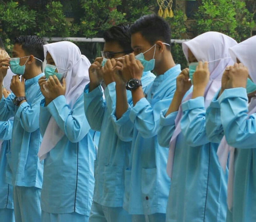 PEKANBARU - Kabut asap mulai menyelimuti Kota Pekanbaru beberapa pekan ini. Meski begitu, belum ada instruksi Pemko Pekanbaru untruk meliburkan aktifitas belajar mengajar. Untuk mengantisipasi siswanya terserang penyakit berdampak kabut asap, Yayasan Fintaru Edukasi Sarana (FES) memberikan masker untuk seluruh siswa siswi SMK Perbankan Riau, Jumat (9/8/2019).