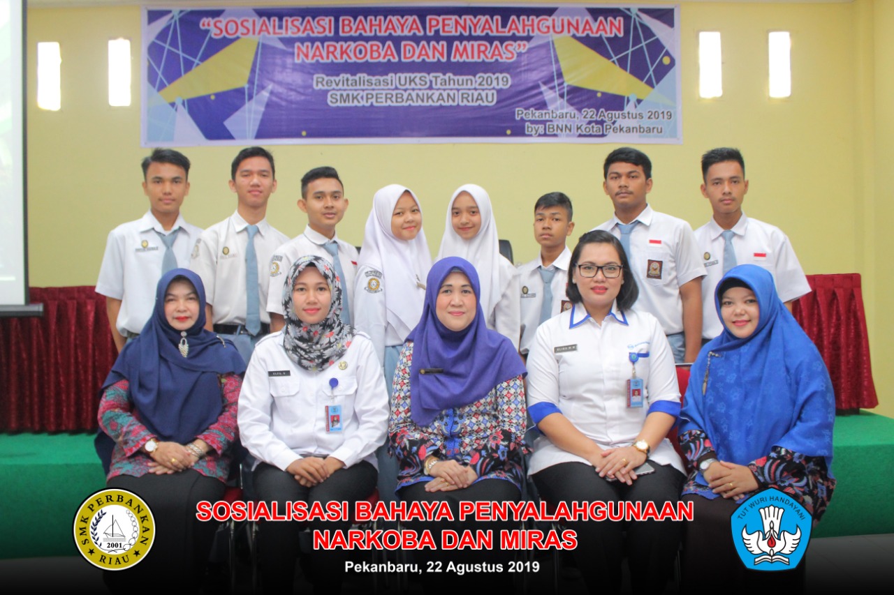PEKANBARU - Guna memberikan pemahaman tentang bahaya penyalahgunaan narkoba dan minuman keras (miras), SMK Perbankan Riau, Kamis (22/8/2019) menggelar sosialisasi bahaya penyalahgunaan narkoba dan miras. Kegiatan yang juga rangkaian program Direktorat Pembinaan SMK Kementerian Pendidikan dan Kebudayaan RI tersebut diikuti siswa siswi SMK Perbankan Riau di
